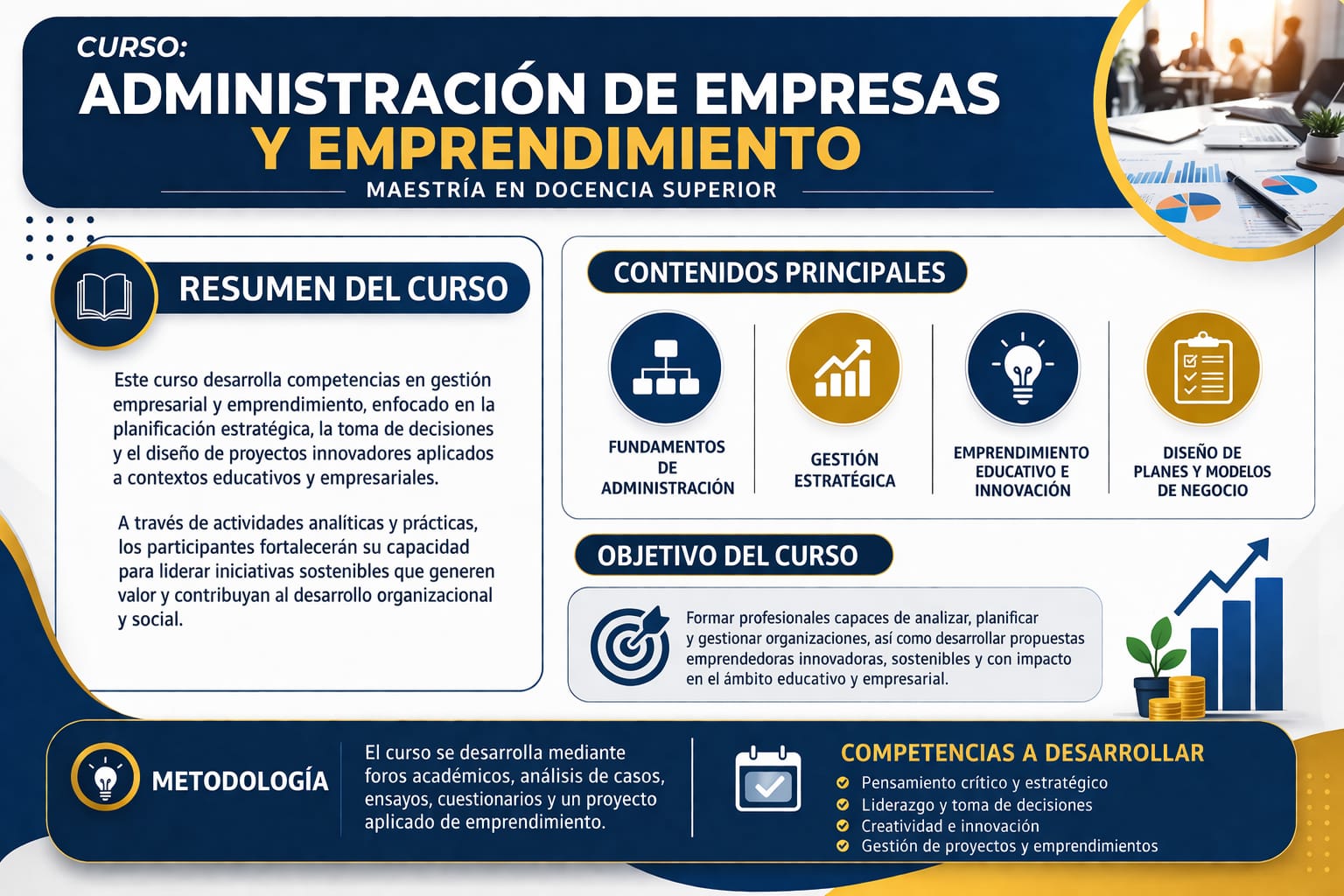 Este curso aborda los fundamentos de la administración de empresas y el emprendimiento desde una perspectiva estratégica y educativa. Se enfoca en el desarrollo de competencias para la planificación, organización, dirección y control de proyectos, así como en la generación de iniciativas innovadoras aplicadas a contextos empresariales y educativos. A través de actividades analíticas y prácticas, los participantes fortalecerán su capacidad para la toma de decisiones y el diseño de propuestas emprendedoras sostenibles.